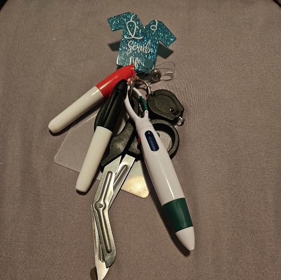 Set includes a multi-color pen and scissors, a sharpie, a dry erase marker, and a tiny white board. Also, includes and LED light