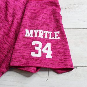 This lightweight pullover active wear top is heather pink with blue, yellow, white and black accents. It has a v-neck with short sleeves. It is in excellent hardly used condition.