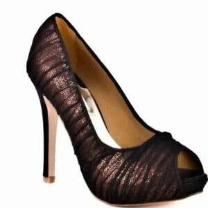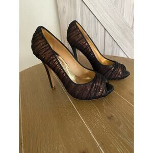 bronze sequins with black overlay platform stilettos peep toe