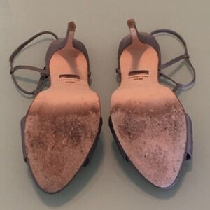 Badgley Mischka Amara Platform Crystal Beaded Ankle Strappy Heels Gray Satin. Size 8.5. Satin and leather heels in a dark grey with an amazingly beautiful crystal and bead embellishment. Worn twice. Comes with box, dustbag and extra heel caps.