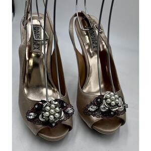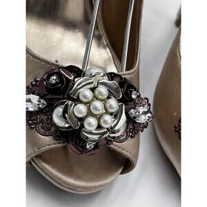 Badgley Mischka Anita Champagne color Satin Peep Toe Platform Stiletto Flower Jewels Sz 6.5.