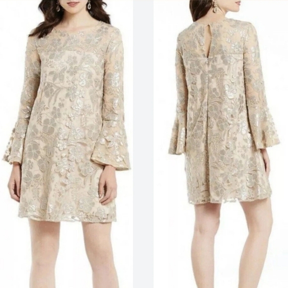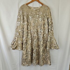 Badgley Mischka Belle Sequin Bell Sleeve Formal Mini Dress 12 Bridal Gown Gold