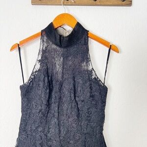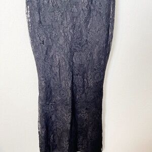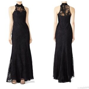 Black lace (100% Nylon). Gown. Sleeveless. High neckline. Hidden back zipper closure. Partially lined. See size and fit tab for length. Imported.