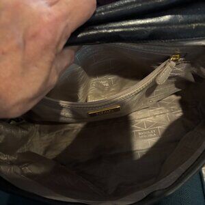 This is a high-end, quality, clean, versatile and classic handbag. Clean inside and out. The strap adjusts so it may be used as a crossbody bag or a shoulder bag, the strap can also be removed to use as a hand held bag. Quality soft leather with calf skin tastefully accented with gold. It measures 11" tall and 13" wide. It closes with both a magnetic clasp and a turn clasp. The clasp shows some wear on the gold that I have illustrated in the last photo. Otherwise in excellent/new condition. As you know Badgley Mischka is known for manufacturing a quality handbag.