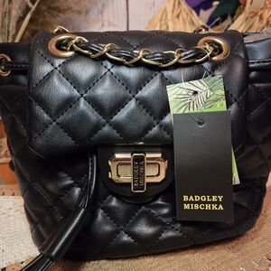 Badgley Mischka Black Quilted Drawstring Backpack with Gold Chain