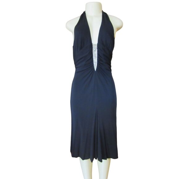 Badgley Mischka Black Rayon Halter Dress w Sheer Clevage & Rhinestones, Size 6