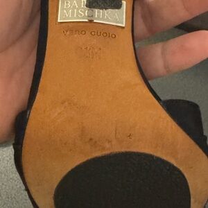These stunning black heels by Badgley Mischka feature a sophisticated d'Orsay cut and a chic bow detail on the toe. Crafted from luxurious satin, they are perfect for formal occasions, offering a timeless elegance with their open-toe design and slingback strap.