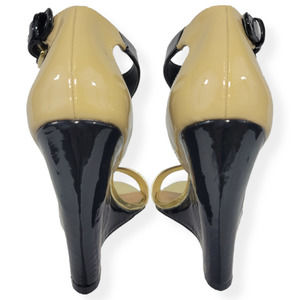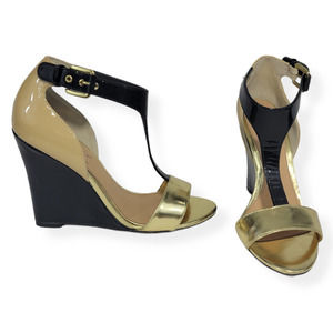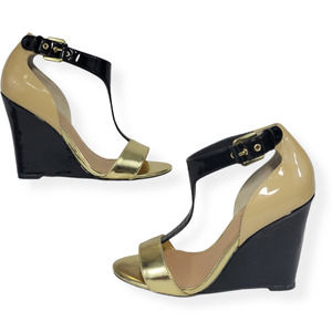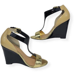 Badgley Mischka Black Tan Gold Ankle Strap Buckle Summer Wedge Heels Sz 6
