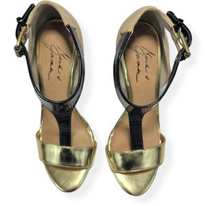 Great, gently used condition Badgley Mischka Mark & James black, tan and gold ankle strap wedge heels. Very clean on the soles, and light wear on the bottoms. Light creasing on the gold strap, small scuff on one of the shoes toe areas and slight bulging in the black wedge as the shoe was originally made, all shown in photos. 4" heel.