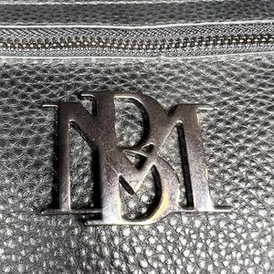 Stylish black textured wallet featuring a prominent logo. Includes a front zipper pocket for convenience.