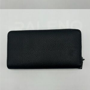The Badgley Mischka black wallet features a sophisticated textured finish and a sleek rectangular design. Its elegant appearance is enhanced by a striking silver emblem on the front, making it a stylish accessory for any occasion. The secure zipper closure ensures your essentials are safely stored.
