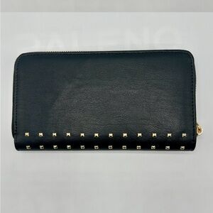 Elegant black wallet with gold stud accents. Sleek design by Badgley Mischka. Perfect for any occasion.