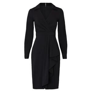 Chic sheath dress with wrap front waist, collared v-neck in a flattering black stretch crepe fabric sophisticated chic. Perfect for career, date night, going out, cocktail party, happy hour, office, conference business event, statement piece
