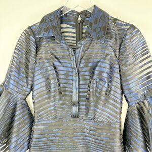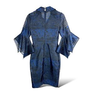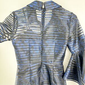 Badgley Mischka Blue Black Sheer Striped Trumpet-Sleeve Cocktail Evening Dress 0