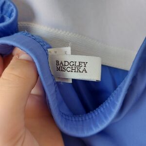 Badgley Mishcka periwinkle blue one piece swimsuit with ruffle on waist, molded lightly padded cup strapless bathing suit.