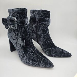 Style/Use: Dressy evening/party booties with statement buckle detail. Labeled style name Badgley Mischka Adrian Velvet Block Heel Booties
