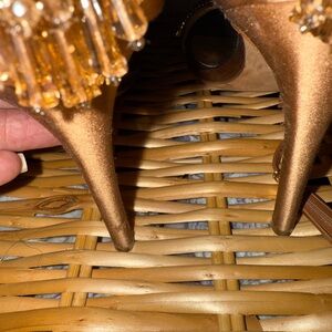 These Badgley Mischka sandals feature a sophisticated brown hue complemented by a striking beaded design. Wore one time to a wedding. Small scuff on left heel. Size 7 and true to size.