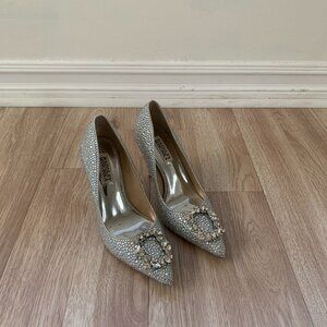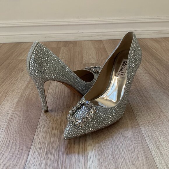 A rhinestone brooch and timeless silhouette add lasting sparkle to dressy looks in the gorgeous Cher II pumps from Badgley Mischka. Per the website, product features include 4 inch stiletto heels, pointed-toe slip-on pumps, and rhinestone brooch hardware detail at toe cap.