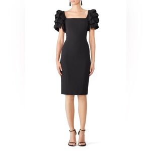This stunning cream midi dress by Badgley Mischka features a chic square neckline and playful puff sleeves, perfect for a bride or wedding guest. The ruffled, tiered design adds a touch of elegance to the sheath silhouette, making it a standout choice for special occasions.