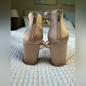 The Jewel Badgley Mischka Natala Latte Satin Rhinestone High Heel Sandals will add a little glam to your evening attire! These stunning heels are shaped from sleek satin, in a taupe-y latte hue, and feature a square toe, with a slender toe band, encrusted with sparkly teardrop and round iridescent rhinestones. A matching heel cup connects to dual elasticized ankle straps. 3.25" zipper at back for easy on and off.