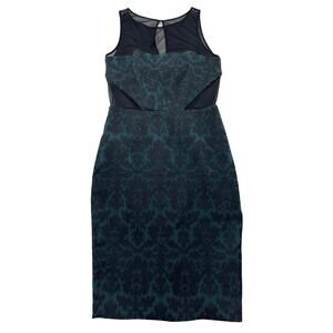 Badgley Mischka Dress 6 Green Black Damask Illusion Neck Sides Sheath Cocktail
