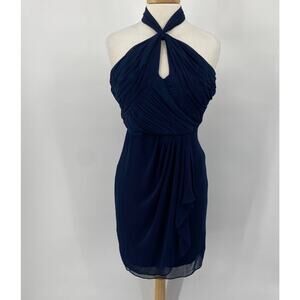 Badgley Mischka Dress Pleated Y Neck Halter Drape Front Mini Navy Blue Womens 4