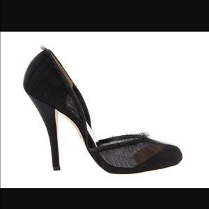 These super sweet sheer rouched gathered tulle pumps have a rounded toe and light ruffle trim. The sheer fabric offers a sexy peek-a-boo of your toes, while the 3 3/4" heel gives that added lift. The upper is of this beautiful shoe is embellished with meshy tulle creating a dreamy, ethereal feel. The shoe gets an alluring lift from a covered high heel, and durability from a leather sole. Plus a metallic lining offers a dash of shine. Worn once! Like new. Satin heel.