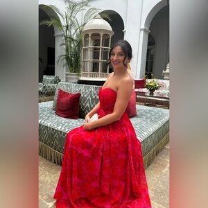 This stunning strapless floral dress features a vibrant red and pink design, perfect for any special occasion. The elegant silhouette and bold colors make it a standout piece in your wardrobe.