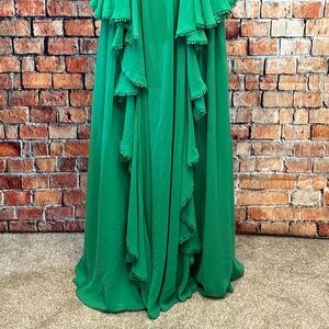 Turn heads in this breathtaking emerald green gown by Badgley Mischka. Featuring elegant pleating throughout and a sleek column silhouette, this dress is perfect for formal events, weddings, or black-tie affairs.