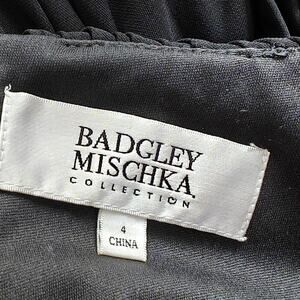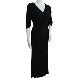 Badgley Mischka evening dress in women's size 4. Solid black. Stretch viscose jersey. v-neckline. Ruched sleeves. Empire waist with twist detail. The back of the skirt has a drape/ train. Back zipper closure. Dress is lined. Gently pre-owned.