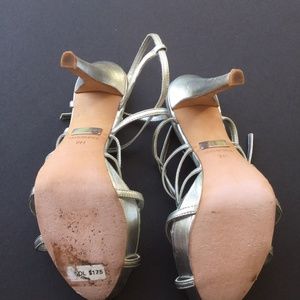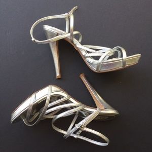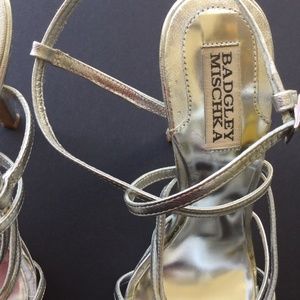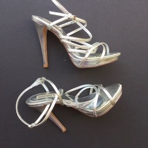 Badgley Mischka FIERCE Strappy Silver platform sandals heels women’s Size 7M Retail-$175 Condition is Pre-owned. worn & used little, but still in good condition. Perfect for any evening event, these shimmering metallic pumps are the perfect accessory. Designed in a strappy silhouette with a platform and covered heel. Leather upper, lining & sole. Heel height 4.5”. Covered heel. see pictures. Price is firm.