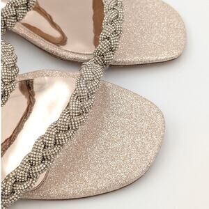 Step into elegance with these breathtaking sandals, embellished with sparkling accents that delicately intertwine to grace your feet. The lustrous soft gold hue enhances their allure, making them a perfect choice for both day and evening wear.
