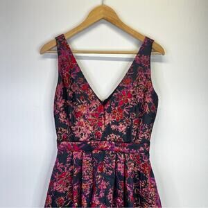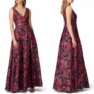 Badgley Mischka Floral Jacquard Gown in pink and multicolor. Crafted from luxurious floral jacquard. Features a sleeveless design and deep V-neckline. The hidden back zipper with a hook-and-eye closure ensures a seamless fit. Fully lined for comfort, this gown also boasts side pockets. A fresh and flattering choice for black-tie events, it exudes grace and glamour with every step.