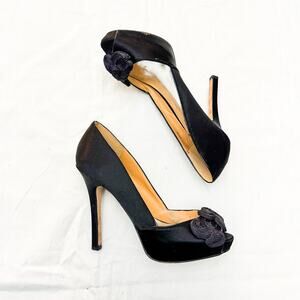 Badgley Mischka Frank Black Satin Rosette Peep Toe Pumps Heels Size 8