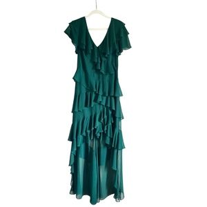 Badgley Mischka Georgette Cascading Emerald Ruffle Gown, High-low Hem, Size 10