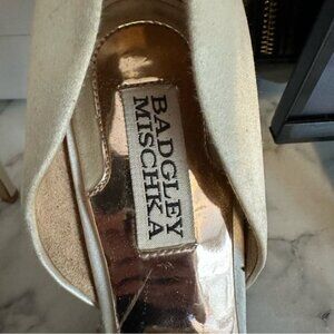Step into elegance with these Badgley Mischka heels, featuring a luxurious cream color and dazzling crystal embellishments. The high stiletto heel and open toe design make them perfect for formal occasions, adding a touch of glamour to any outfit.