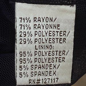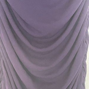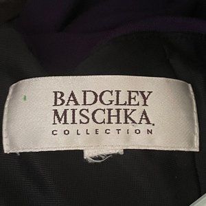 This is a formal Badgley Mischka gorgeous deep purple color fitted gathered floor length gown featuring a back zipper. Its a bit stretchy because of the gathered style in front, on the sides and back and looks like Old Hollywood Glamour. Its partially lined, and the dress fabric is 71% rayon/ 29% polyester and the lining is 95% polyester/5% spandex. The size tag is missing so here are some flat measurements: pit to pit 18", waist 16", hips 17", length from shoulder to bottom hem of gown 57". Remember these are approximate measurements and the dress is stretchy because of the gathered style so it has some give to it. Glamorous!