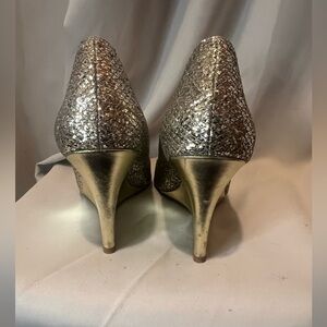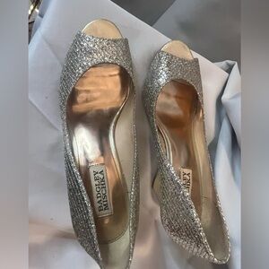 Step into elegance with these Badgley Mischka gold wedges, featuring a dazzling glitter finish that captures light beautifully. The peep-toe design and moderate wedge height offer a perfect blend of style and comfort, making them ideal for weddings or formal events.
