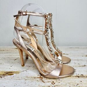 Badgley Mischka Rose Gold Leather Rhinestone Jeweled Embellished Strappy Pumps