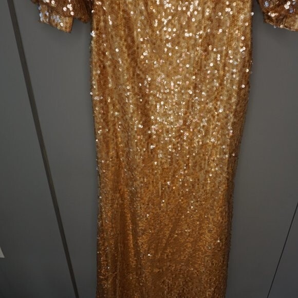 Product Features: Golden sequins cover this gown from its boat neckline to the floor-brushing hem. Slightly fitted at the waist, this dress also features half-cuffed sleeves that end just below the elbow. Enjoy ease of movement paired with a feminine silhouette thanks to this beautiful design.