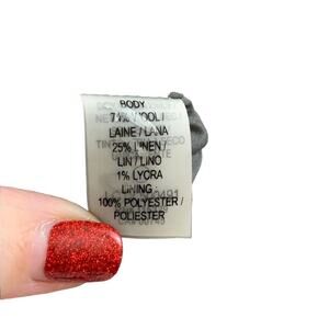 Size 8. 71% Wool 25% Linen 1% Lycra. Lined 100% Polyester. Length 20 inches. Armpit to armpit 18 inches. Sleeve length 23 inches. Dressy. Metal buttons. Shoulder pads. Great condition!