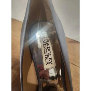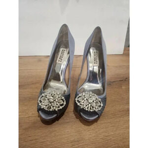 Badgley Mischka Heels with Embellishments Open Toe Size 6. Pre owned with very light wear. There are a few sticker pieces left on the bottom of both shoes. The color is a grayish blue, color may vary because of lighting.