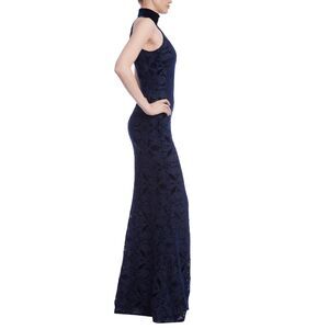 The rich velvet lace is fashioned in a deep, charming navy blue and features a detailed floral pattern, adding textural elegance. The high neckline lends a regal touch, while the sleeveless design highlights your shoulders and arms, adding a modern edge. Complete with a fitted silhouette that hugs your curves beautifully, this gown creates a flawless, flattering shape.
