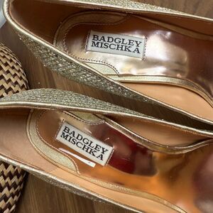 Badgley Mischka Gumbie II prep toe Silver glitter and gold thread heels with leather sole. Worn once very briefly. 5 inch heel.