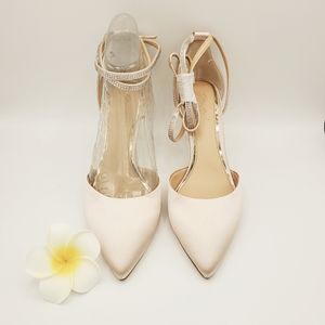 Two rows of tiny crystals add up to classy sparkle and shine on a satin pump featuring a crisscrossed double ankle strap and just-right heel. Perfect bridal/dressy shoes❤ Adjustable strap with buckle closure Color ID Champagne Satin Closed toes and backs Lightly padded footbed 2.75" heel height All manmade New without box # d'orsay style