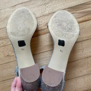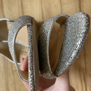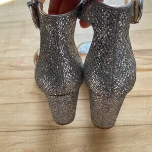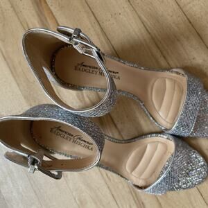 These Badgley Mischka jeweled sandals in size 7.5 are perfect for a bridal party, party, or formal occasion. The strappy design with a block heel, open toe, and glitter accents adds a touch of glamour. The silver color and argyle/diamond pattern give them a stylish and elegant look. Made of manmade materials with a rubber outsole, these sandals are comfortable and perfect for any season. The adjustable ankle strap ensures a secure fit, making them a stylish and practical choice for any event.
