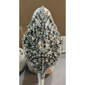 Peep-toe platform pump featuring dramatic cluster of sparkling rhinestones at heel counter