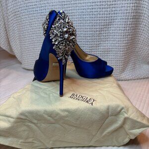 Badgley Mischka Kiara peep-toe platform pumps in blue satin with a crystal-embellished heel