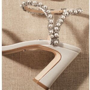 Pearly straps and rhinestone details make these modern block heels a bridal essential.