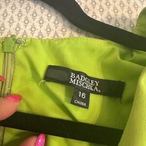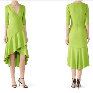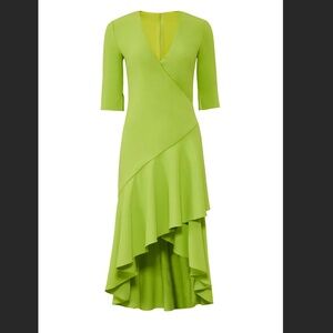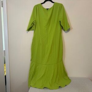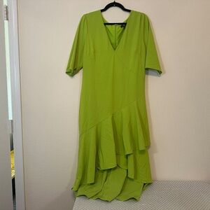 Lime green odessa crepe (98% Polyester, 2% Spandex). Sheath. Short sleeves. V-neckline. Hidden back zipper with hook-and-eye closure. Partially lined. 39" from shoulder to hemline. Imported.